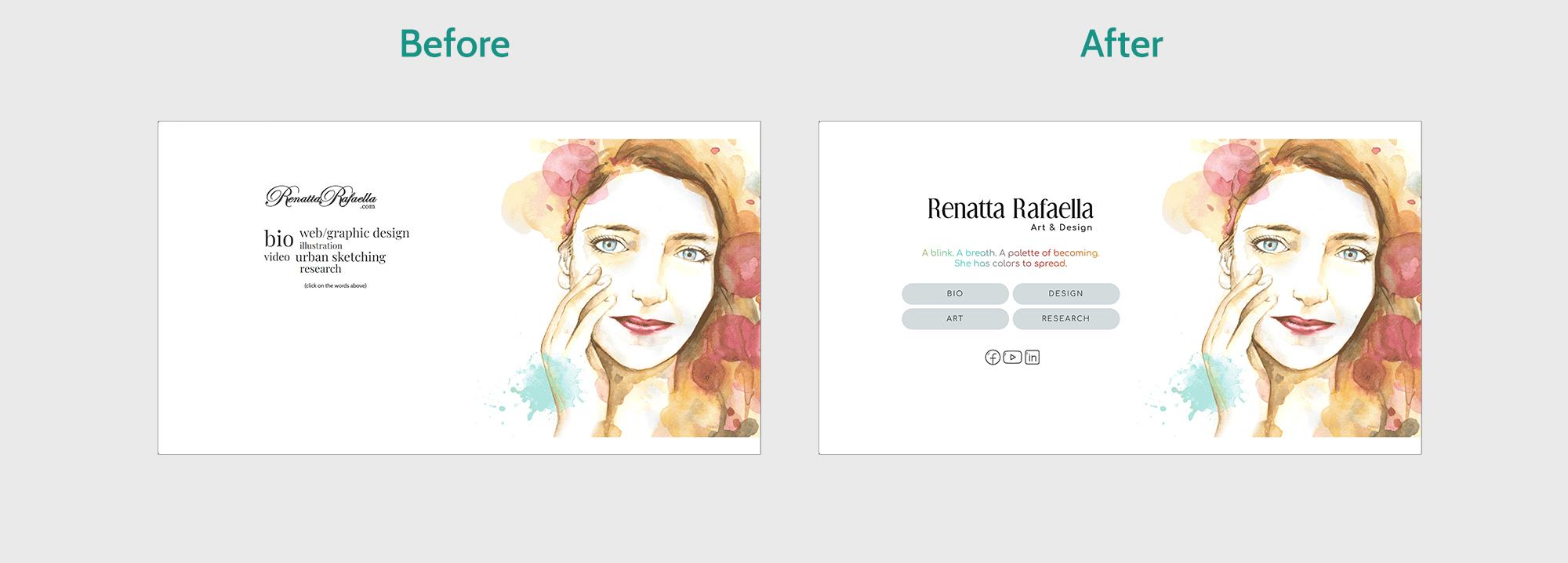 The first step was simplifying the homepage. I reduced the number of buttons and renamed the categories using familiar, recognizable labels that help users understand where each path leads. The animated watercolor portrait remained at the center of the experience — it captures my energy and presence in a way no static layout could — but the surrounding structure became more intentional and intuitive.