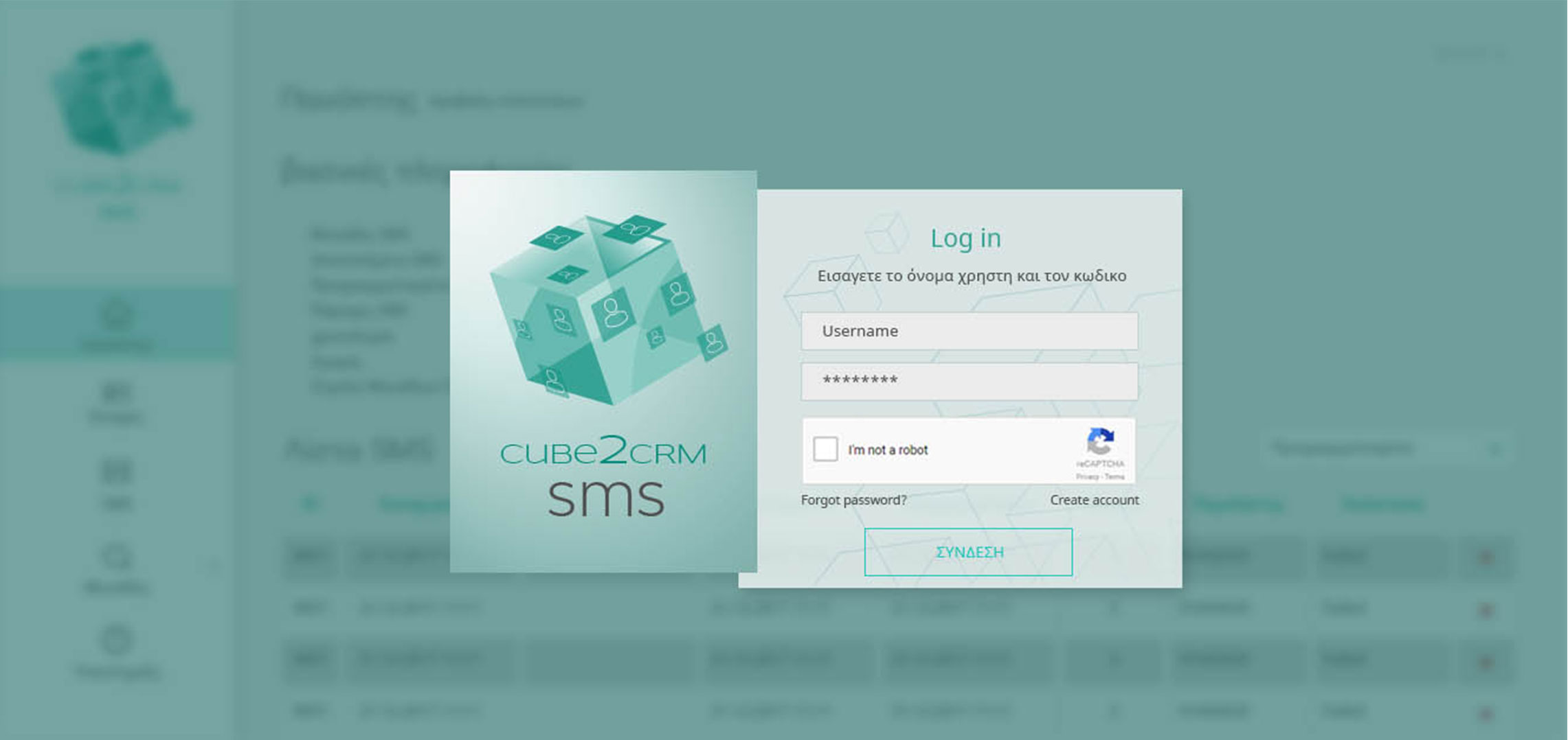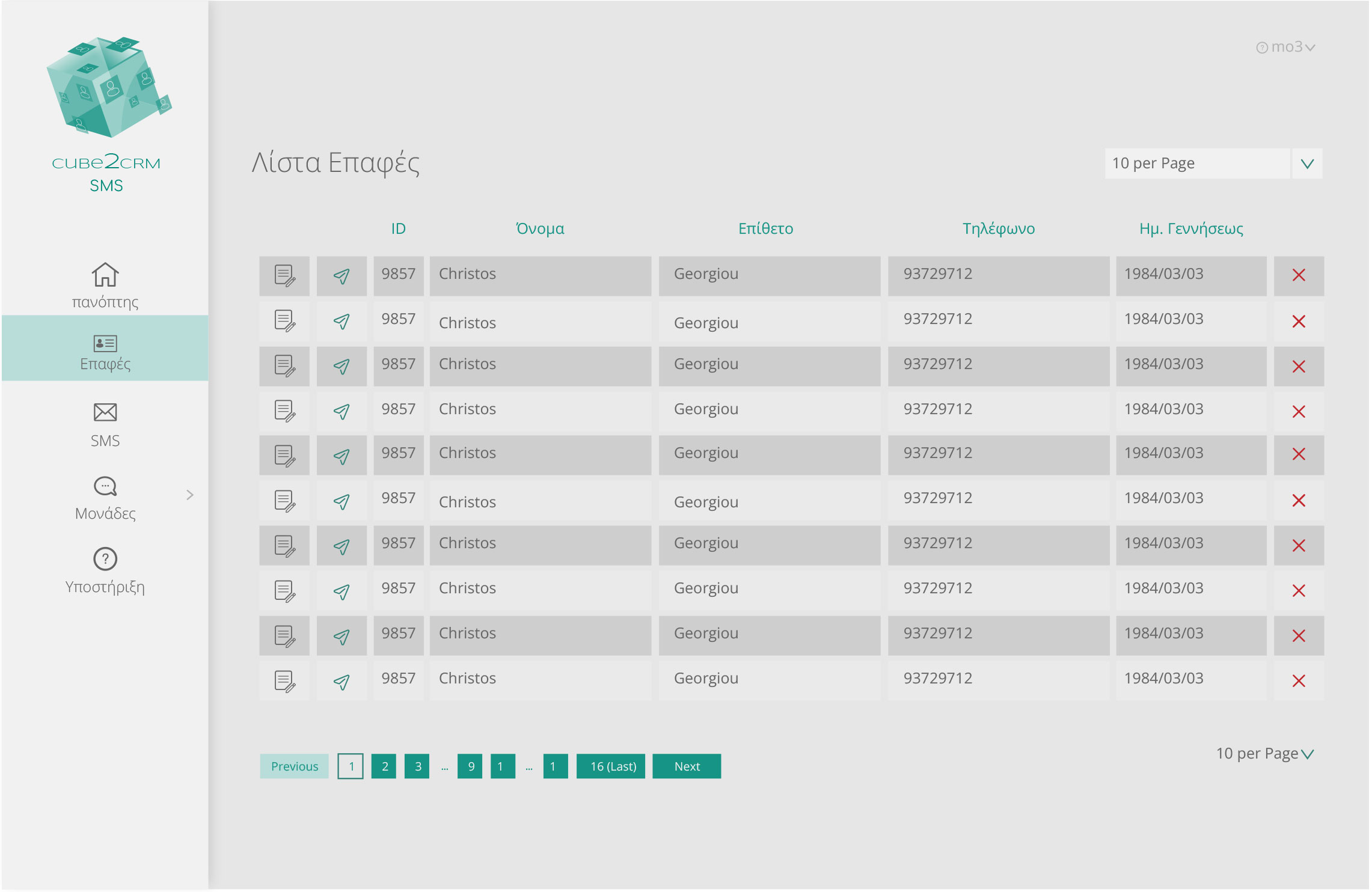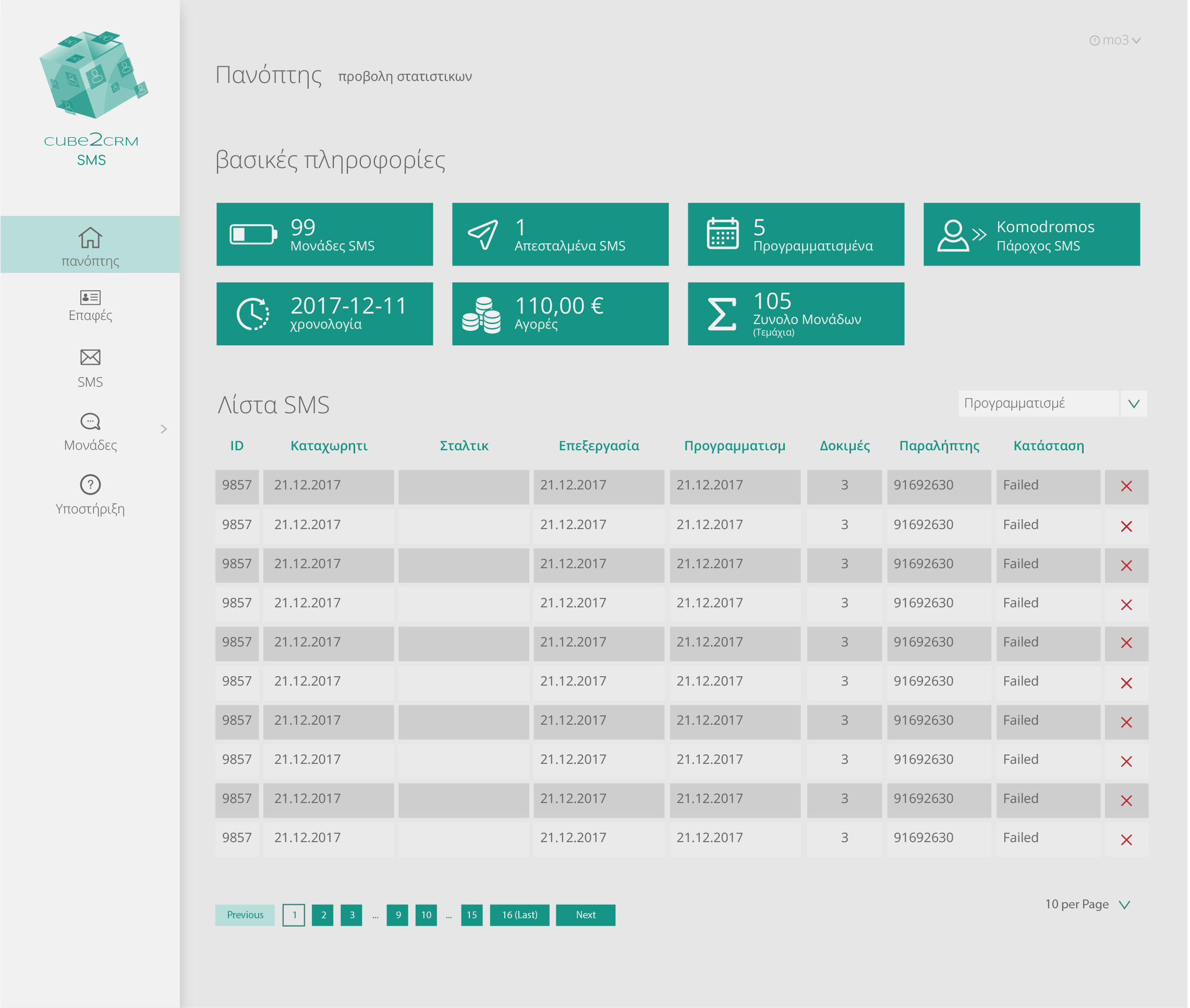 This CRM interface integrates SMS campaign management with contact tracking in a clean, functional layout tailored for Greek-speaking users.